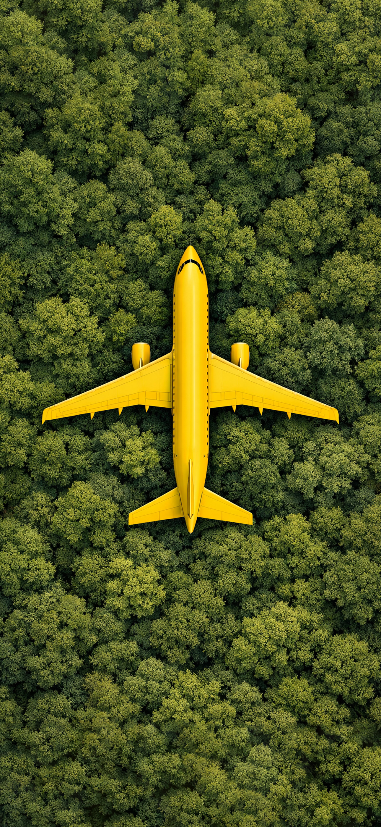 طائرة صفراء تخترق سماء غابة خضراء كثيفة في لقطة علوية مبهرة، تباين قوي بين لون الطبيعة الهادئ والطائرة الجريئة، يمنح إحساسًا بالحرية والمغامرة والانطلاق بلا حدود. خلفية مثالية لمحبي السفر والمناظر الجوية والتصاميم النظيفة.