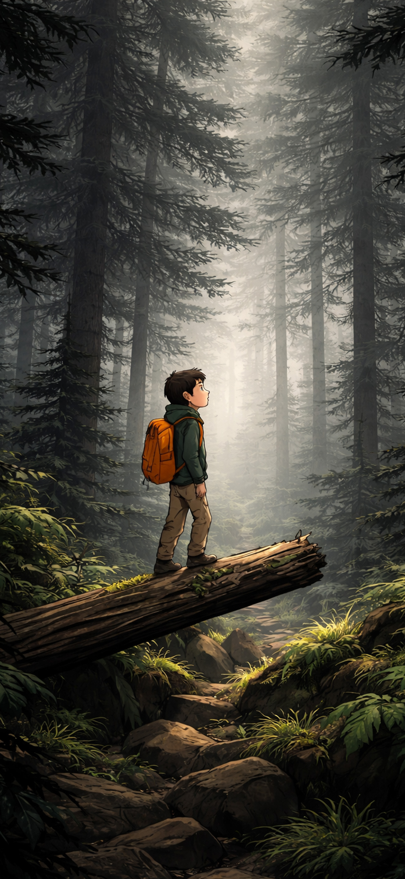 شخص يقف وحيدًا فوق جذع شجرة في قلب غابة صامتة، تحيط به الأشجار الطويلة والضباب الكثيف. لحظة تأمل قبل الخطوة التالية، حيث يمتزج الفضول بالهدوء، وتتحول الرحلة إلى اكتشاف داخلي أكثر منها طريقًا مرئيًا.