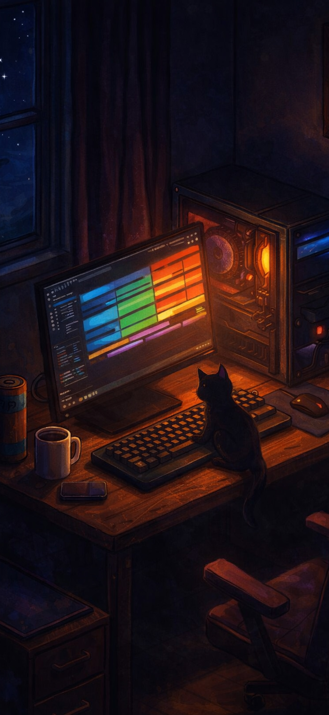 على المكتب شاشة كمبيوتر مضيئة، تعرض واجهة مليئة بالألوان المتناسقة، خطوط وأشرطة لونية توحي ببرنامج عمل إبداعي، ربما برمجة، مونتاج، أو تصميم. الألوان ليست صاخبة، بل مدروسة، تعكس تركيزًا عميقًا وعقلًا منغمسًا في العمل. الشاشة هي المصدر الرئيسي للضوء، وتلقي بوهجها على لوحة المفاتيح، الفأرة، وحتى على القط الجالس أمامها.