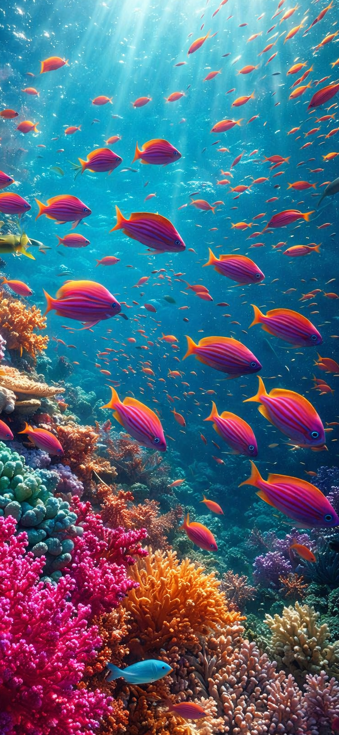ما يميز هذه الخلفية هو ثراء التفاصيل ودقة الألوان. الأسماك بألوانها الزاهية، التي تتدرج بين الوردي، البرتقالي، والأصفر، تتحرك في انسجام رائع وسط المياه، وكأنها جزء من رقصة جماعية لا بداية لها ولا نهاية. هذه الحركة الطبيعية تمنح الخلفية إحساسًا بالحياة، وتجعل الشاشة تبدو وكأنها تنبض بالحيوية في كل مرة تفتح فيها هاتفك.