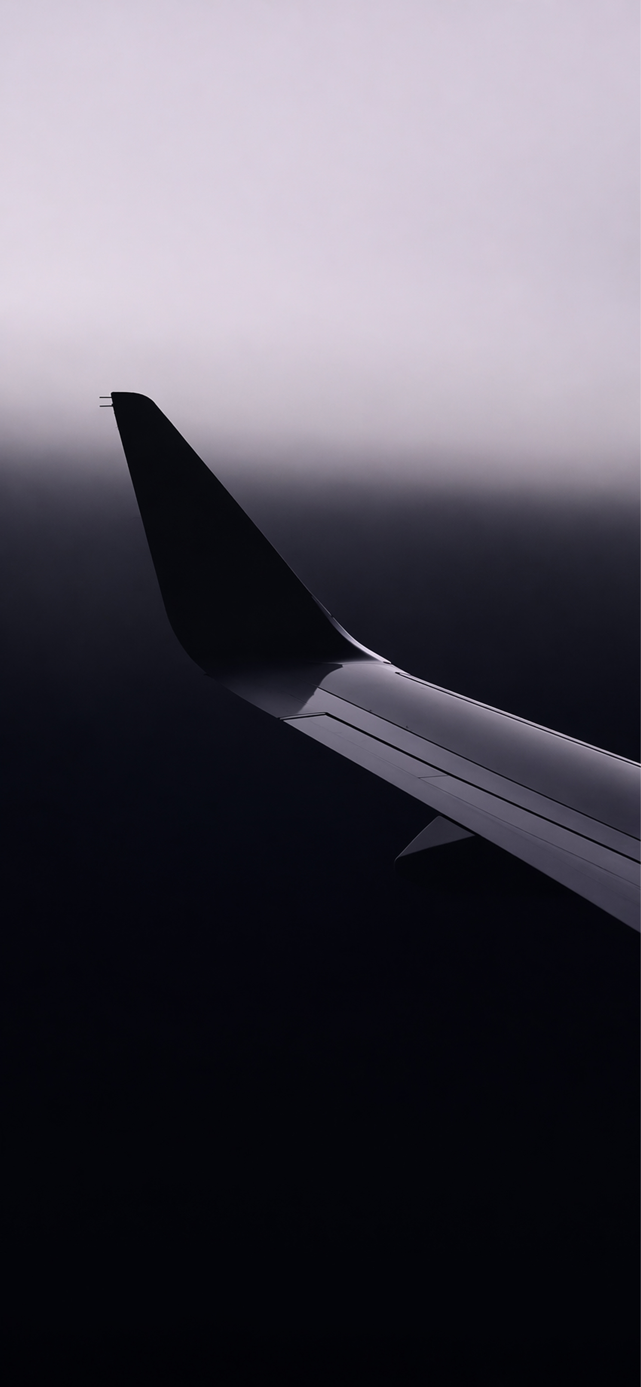 الجناح هنا ليس مجرد جزء من طائرة، بل رمز للحركة المستمرة، للتقدم، للسفر دون قيود. يظهر بخطوط نظيفة وحادة، بتصميم يعكس الدقة الهندسية والبساطة في نفس الوقت. اللون الداكن يسيطر على المشهد، لكنه ليس ظلامًا خانقًا، بل هو ظلام مريح، أشبه بليل هادئ يمنحك فرصة للتفكير، للتركيز، أو حتى للراحة البصرية.